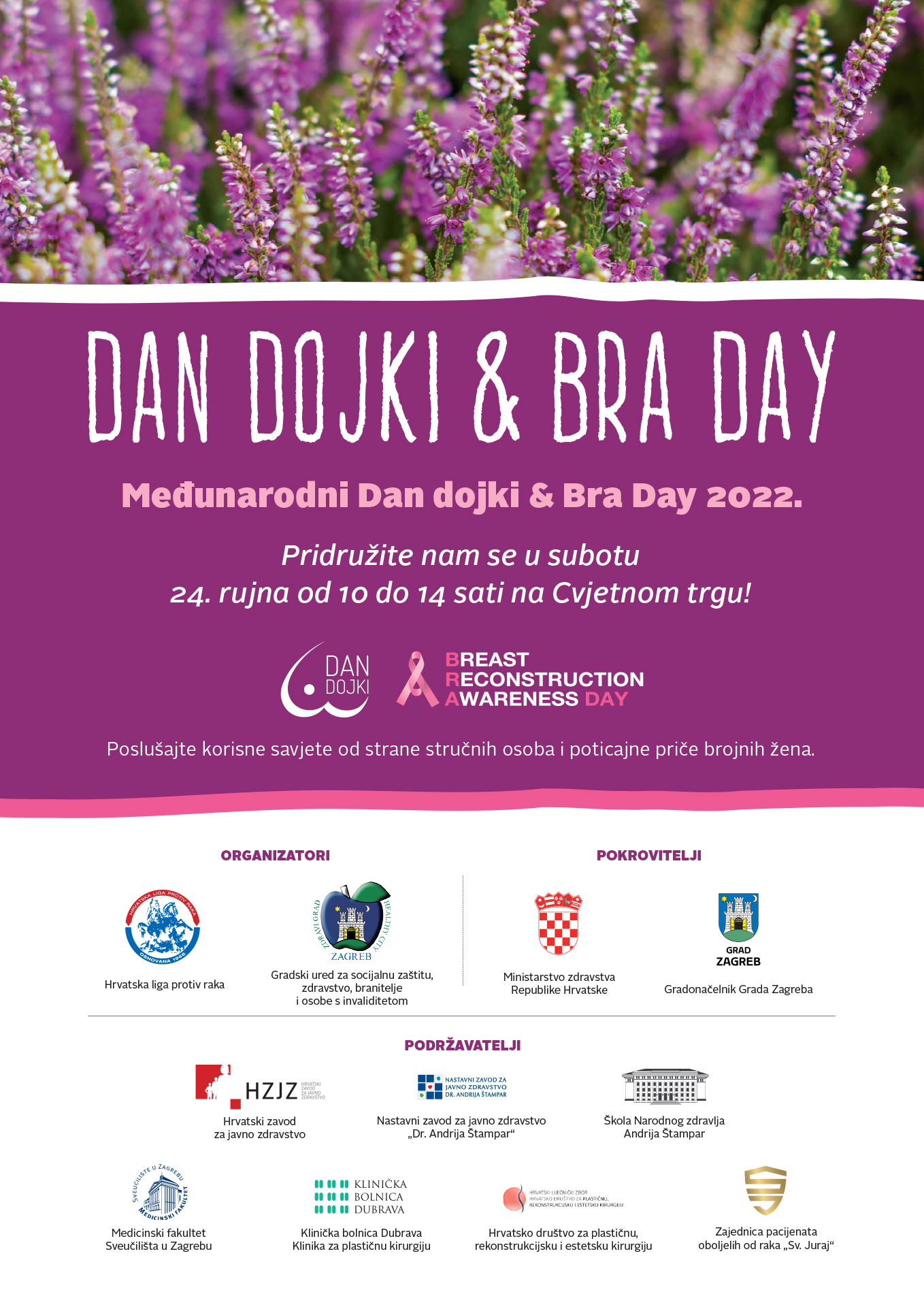 Humanitarnom prodajom simboličnih sadnica vrijeska, žilave ukrasne biljke koja se ne predaje lako pod utjecajem raznih vremenskih uvjeta će se uz podjelu informativnih i edukativnih letaka te poticajne priče brojnih žena ali i savjete stručnjaka na zagrebačkom Cvjetnom trgu obilježiti „Dan dojki – BRA DAY 2022.“.