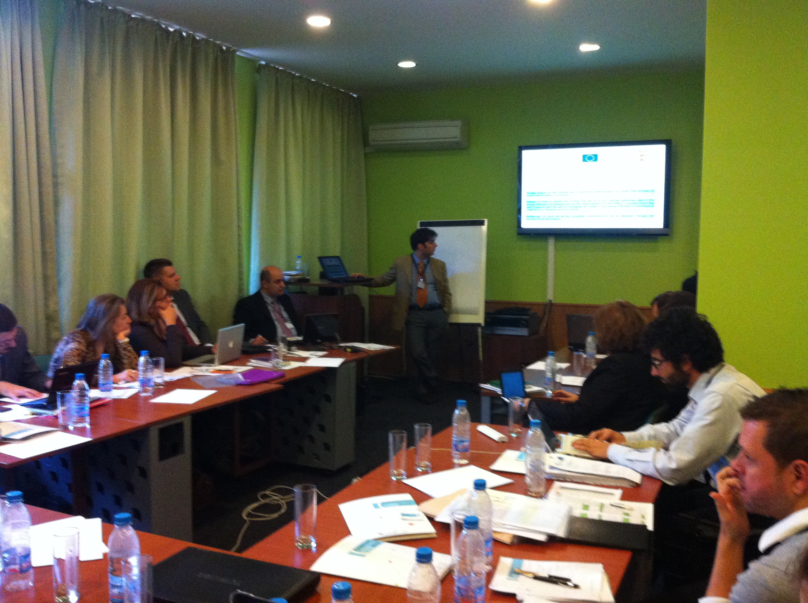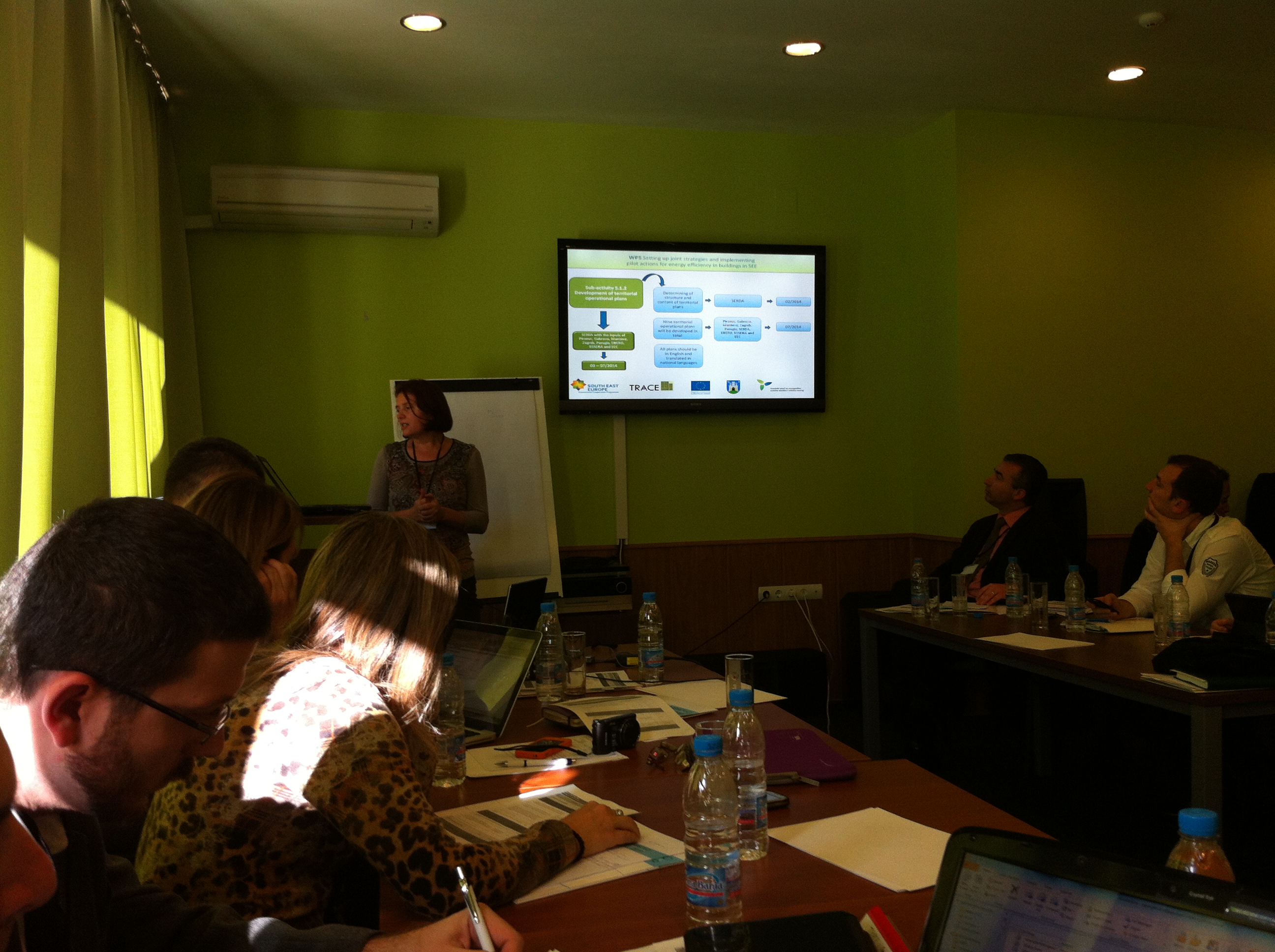 Prvog dana sastanka koordinator projekta grad Piraeus ukratko je predstavio projekt TRACE te predstavio novog partnera - Provinciju Mantova koja se je naknadno priključila projektu. Nakon uvodnog dijela sastanka, održane su prezentacije o izvješćima po pojedinim radnim paketima. Projekt se sastoji od ukupno 6 radnih paketa te je svaki partner koordinator pojedinog radnog paketa predstavio izvješće o svom radnom paketu. Kako je Grad Zagreb koordinator radnog paketa 5 (WP5 – Stvaranje zajedničke strategije i provođenje pilot aktivnosti za energetsku učinkovitost zgradarstva na području Jugoistočne Europe) održala sam prezentaciju u kojoj sam predstavila WP5, najvažnije zadatke i aktivnosti te plan slijedećih aktivnosti koje je potrebno provesti u suradnji s ostalim partnerima. Nakon svake prezentacije radnih paketa održane su konzultacije među svim partnerima na kojima su se detaljnije obradile aktivnosti projekta.