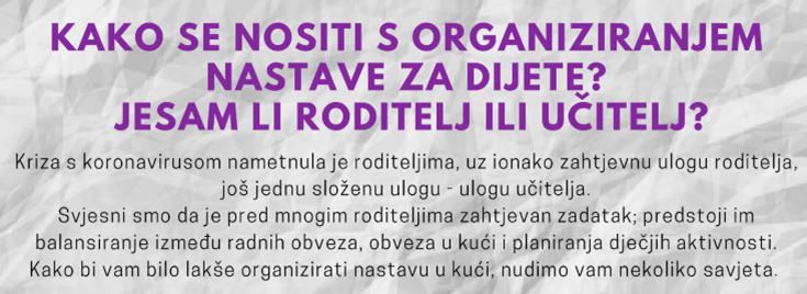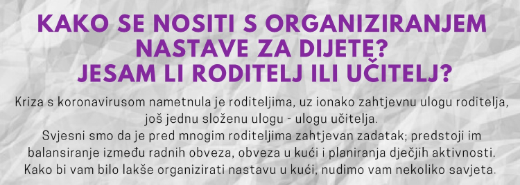 Kriza s koronavirusom nametnula je roditeljima, uz ionako zahtjevnu ulogu roditelja, još jednu složenu ulogu - ulogu učitelja. Kako bi Vam pokušali olakšati nositi se s ovim zahtjevnim zadatkom, u nastavku Vam pružamo smjernice Odgojnog savjetovališta Centra za rehabilitaciju Edukacijsko-rehabilitacijskog fakulteta koje možete preuzeti na sljedećoj poveznici: