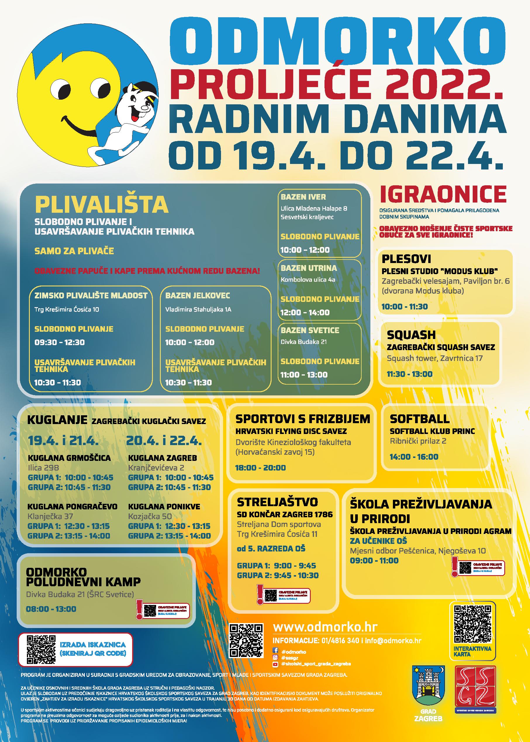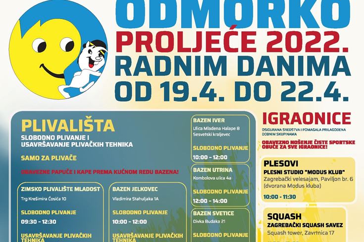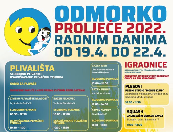 Školski sportski savez Grada Zagreba za vrijeme proljetnog odmora učenika organizira besplatne sportske aktivnosti u sklopu programa Odmorko proljeće 2022. Za školarce su pripremljene sljedeće sportske aktivnosti: slobodno plivanje i usavršavanje plivačkih tehnika na Zimskom plivalištu Mladost i bazenima Jelkovec, Iver, Utrina i Svetice, kuglanje, squash, streljaštvo, škola preživljavanja u prirodi, plesovi, softball, sportovi s frizbijem te odmorko poludnevni kamp.