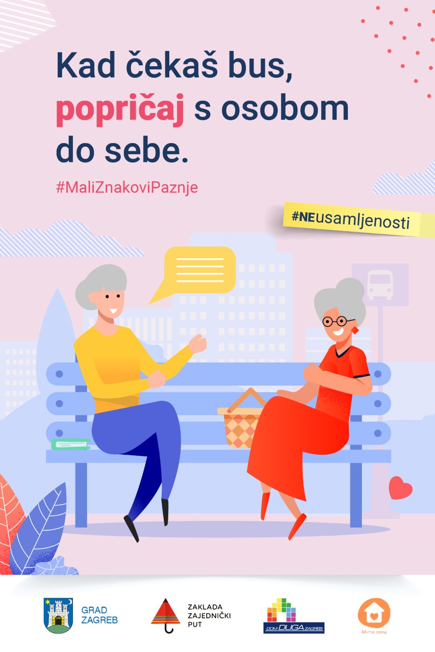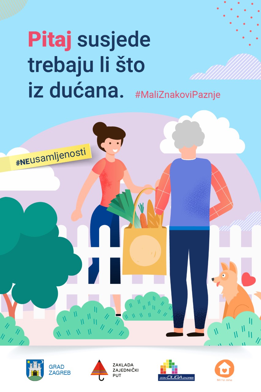 Kampanja Grada Zagreba, Zaklade „Zajednički put“, Doma za djecu i odrasle žrtve nasilja u obitelji “Duga – Zagreb”  i udruge Mirna Zona usmjerena je na ohrabrivanje građana na akcije kojima će otkloniti osjećaj izoliranosti kod sebe i drugih, a posebice se odnosi na osobe starije dobi.