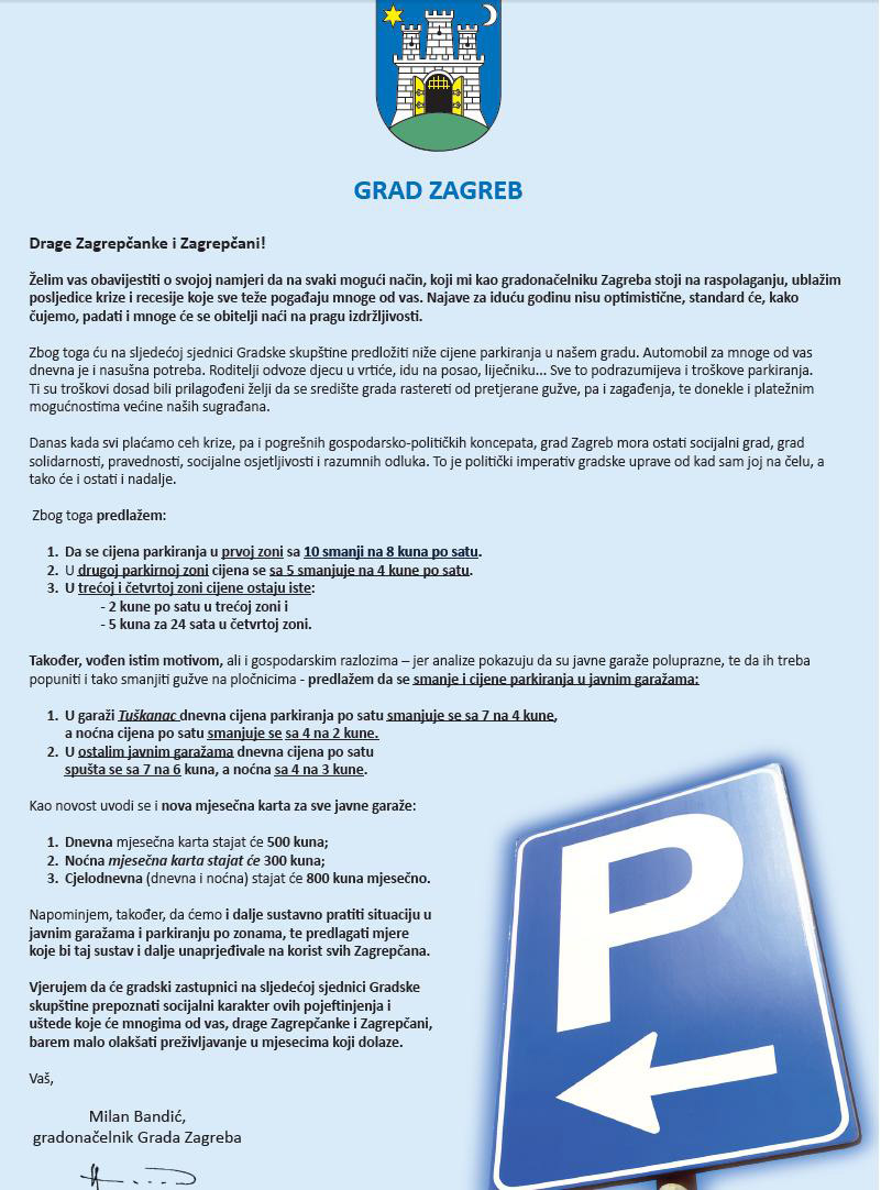 Želim vas obavijestiti o svojoj namjeri da na svaki mogući način, koji mi kao gradonačelniku Zagreba stoji na raspolaganju, ublažim posljedice krize i recesije koje sve teže pogađaju mnoge od vas. Najave za iduću godinu nisu optimistične, standard će, kako čujemo, padati i mnoge će se obitelji naći na pragu izdržljivosti.