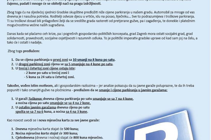 Zbog toga ću na sljedećoj sjednici Gradske skupštine predložiti niže cijene parkiranja u našem gradu. Automobil za mnoge od vas dnevna je i nasušna potreba. Roditelji odvoze djecu u vrtiće, idu na posao, liječniku... Sve to podrazumijeva i troškove parkiranja. Ti su troškovi dosad bili prilagođeni želji da se središte grada rastereti od pretjerane gužve, pa i zagađenja, te donekle i platežnim mogućnostima većine naših sugrađana.