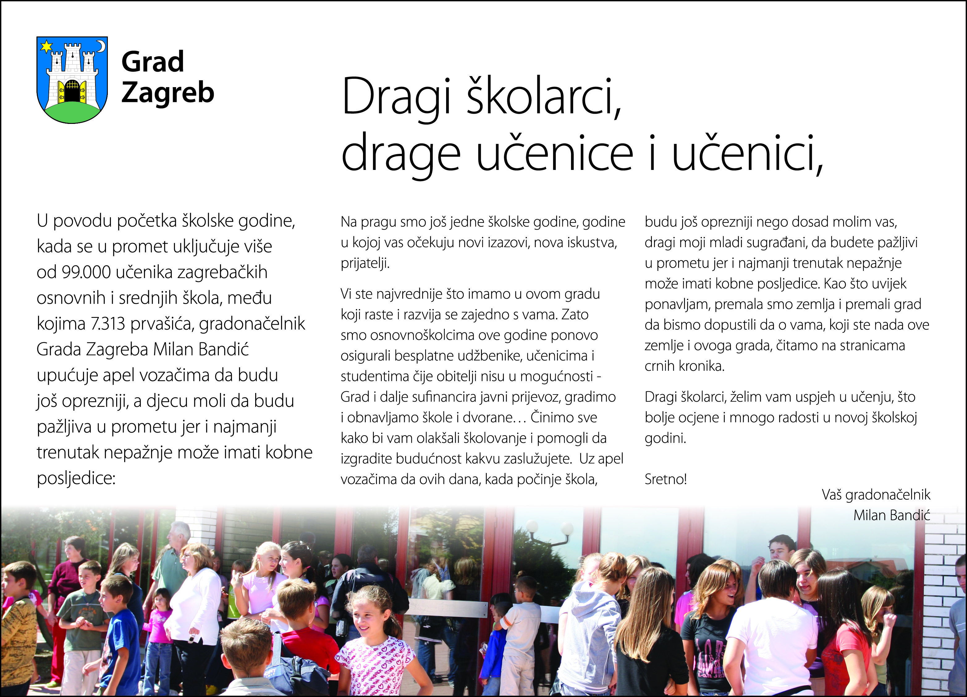 U povodu početka školske godine, kada se u promet uključuje više od 99.000 učenika zagrebačkih osnovnih i srednjih škola, među kojima 7.313 prvašića, gradonačelnik Grada Zagreba Milan Bandić upućuje apel vozačima da budu još oprezniji, a djecu moli da budu pažljiva u prometu jer i najmanji trenutak nepažnje može imati kobne posljedice: