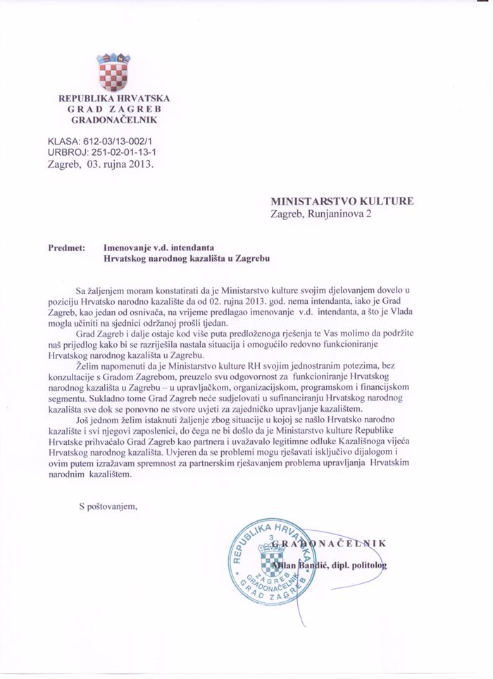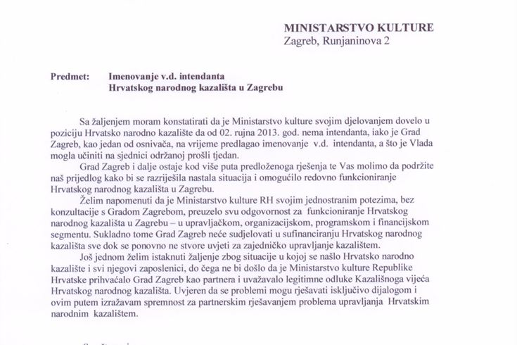 Sa žaljenjem moram konstatirati da je Ministarstvo kulture svojim djelovanjem dovelo u poziciju Hrvatsko narodno kazalište da od 02. rujna 2013. god. nema intendanta, iako je Grad Zagreb, kao jedan od osnivača, na vrijeme predlagao imenovanje v.d. intendanta, a što je Vlada mogla učiniti na sjednici održanoj prošli tjedan.
