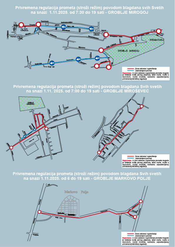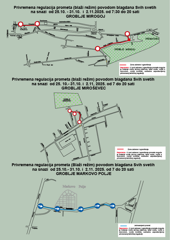 od 25. 10. pa do 02. 11. 2025. godine prema zonama glavnih gradskih groblja, MIROGOJ, MIROŠEVEC I MARKOVO POLJE, kao i manjim lokalnim grobljima, linije javnog gradskog prijevoza putnika bit će prema potrebi pojačane s dodatnim kapacitetima.