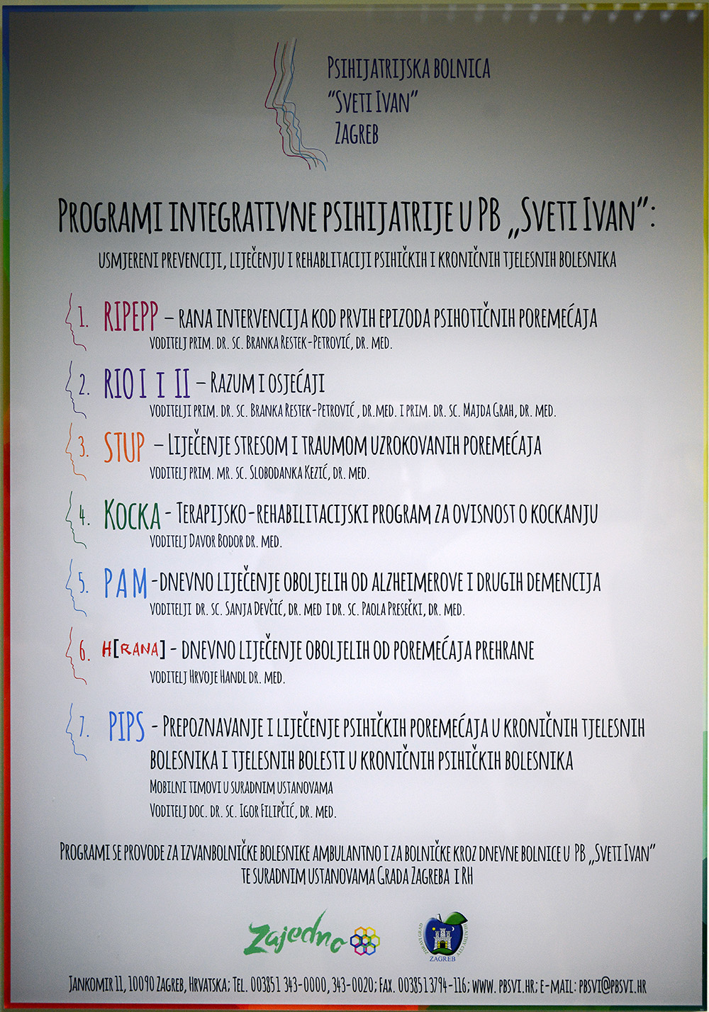 U Psihijatrijskoj bolnici Sveti Ivan, u nazočnosti zamjenica gradonačelnika Grada Zagreba Sandre Švaljek i Vesne Kusin, sa suradnicima, predstavljeno je sedam novih suvremenih programa integrativne psihijatrije s cilljem prevencije, liječenja i rehabilitacije psihičkih bolesnika te rad Kluba pacijenata Zajedno.