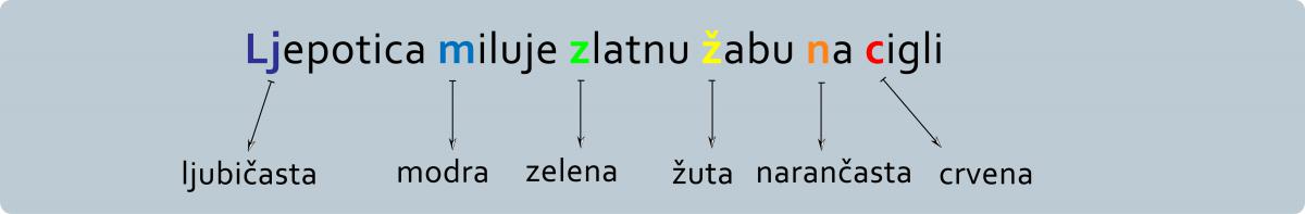 Primjer 2.: Mnemotehnike - Kako naučiti redoslijed boja u spektru (ljubičasta, modra, zelena, žuta, narančasta, crvena)