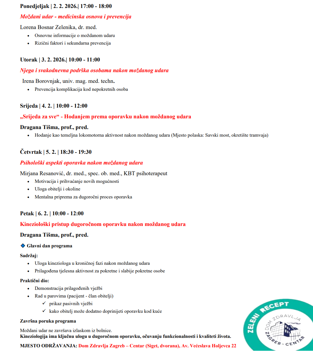 Dom zdravlja Zagreb – Centar u sklopu projekta „Zeleni recept“ i obilježavanja Dana crvenih haljina organizira edukativni tjedan pod nazivom „Moždani udar: kineziološki pristup dugoročnom oporavku“, koji će se održati od 2. do 6. veljače u Domu zdravlja Zagreb – Centar, dvorana Siget, Avenija Većeslava Holjevca 22.