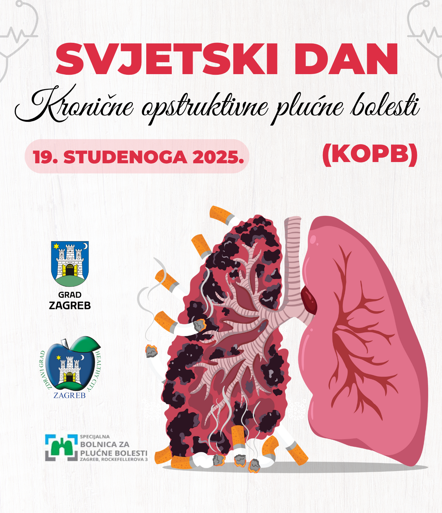Povodom Svjetskog dana kronične opstruktivne plućne bolesti (KOPB), koji se obilježava treće srijede u studenome, Specijalna bolnica za plućne bolesti u suradnji s Gradskim uredom za socijalnu zaštitu, zdravstvo, branitelje i osobe s invaliditetom Grada Zagreba održala je 19. studenoga 2025. godine javnozdravstvenu akciju na Tribini Grada Zagreba, Kaptol 27, u vremenu od 9.00 do 15.00 sati.