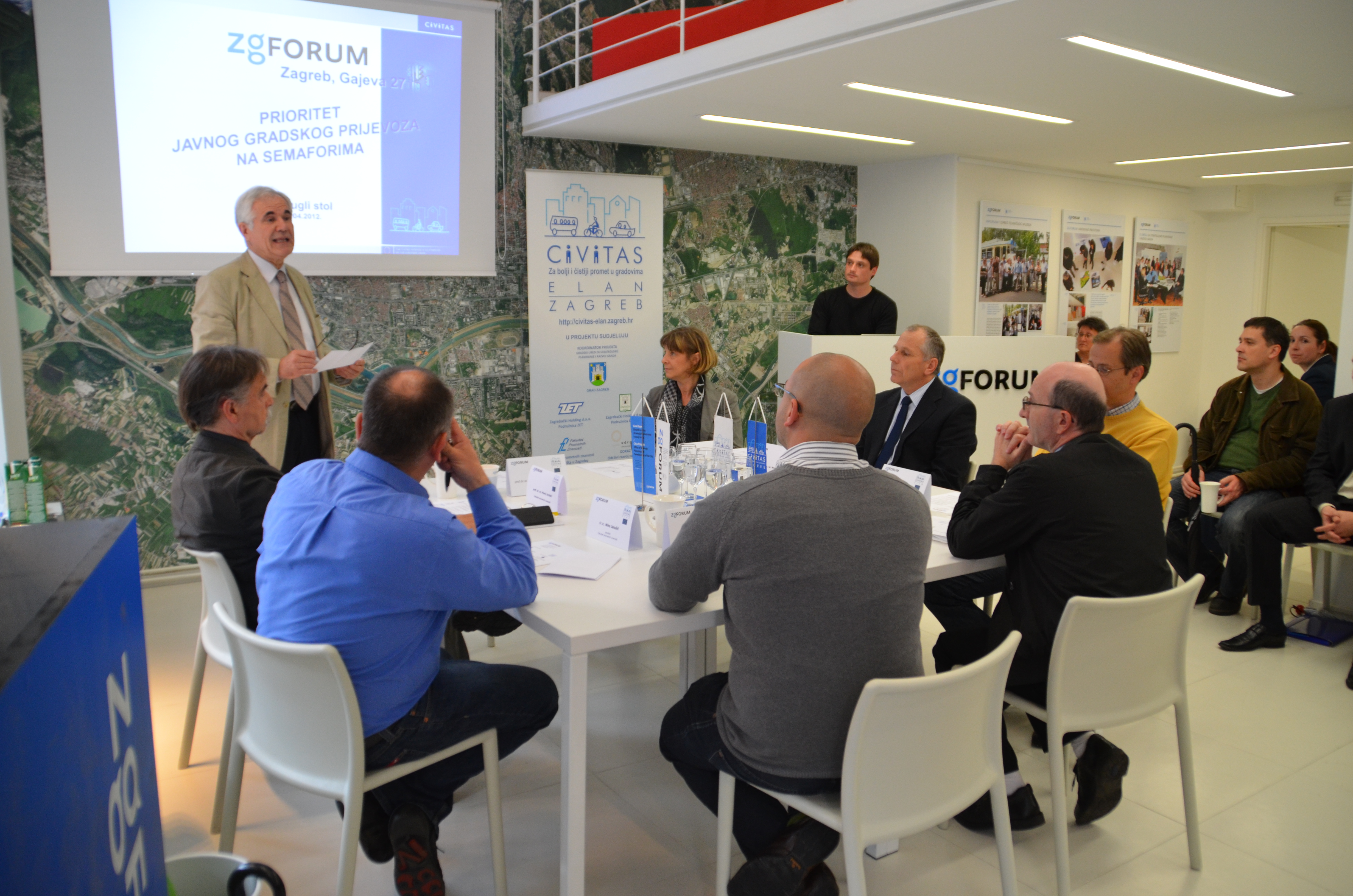 Nakon toga očekuje se aktivno učešće stručnjaka i građana u diskusiji na temu učinkovitosti semafora u funkciji prioriteta javnog gradskog prijevoza u Gradu Zagrebu. Moderator okruglog stola bio je prof. dr. sc. Stanislav Pavlin, voditelj projekta CIVITAS ELAN na Fakultetu prometnih znanosti. Uvodne prezentacije održali su prof.dr.sc. Hrvoje Gold, prodekan i prof.dr.sc. Mario Anžek, dr.sc. Niko Jelušić i Miroslav Vujić, dipl,ing., asistent, svi s Fakulteta prometnih znanosti, mr.sc. Zdenko Lanović iz tvrtke Elipsa-S.Z. d.o.o..