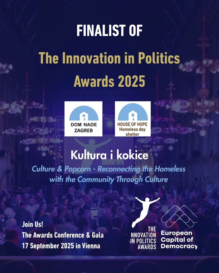 Kultura i kokice – ponovna povezanost beskućnika sa zajednicom kroz kulturu finalist je prestižne nagrade Innovation in Politics Awards 2025, u kategoriji Društvena kohezija i integracija.