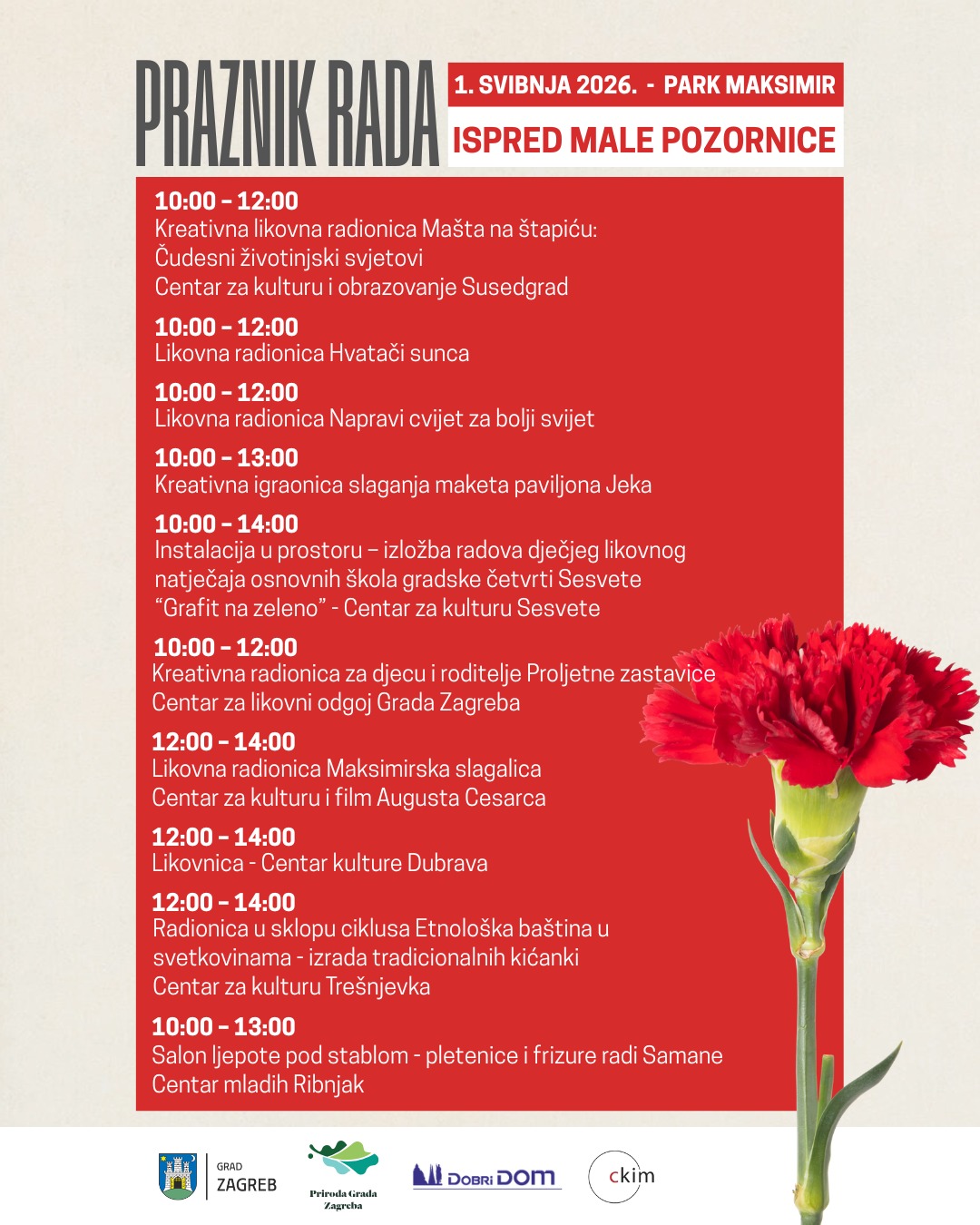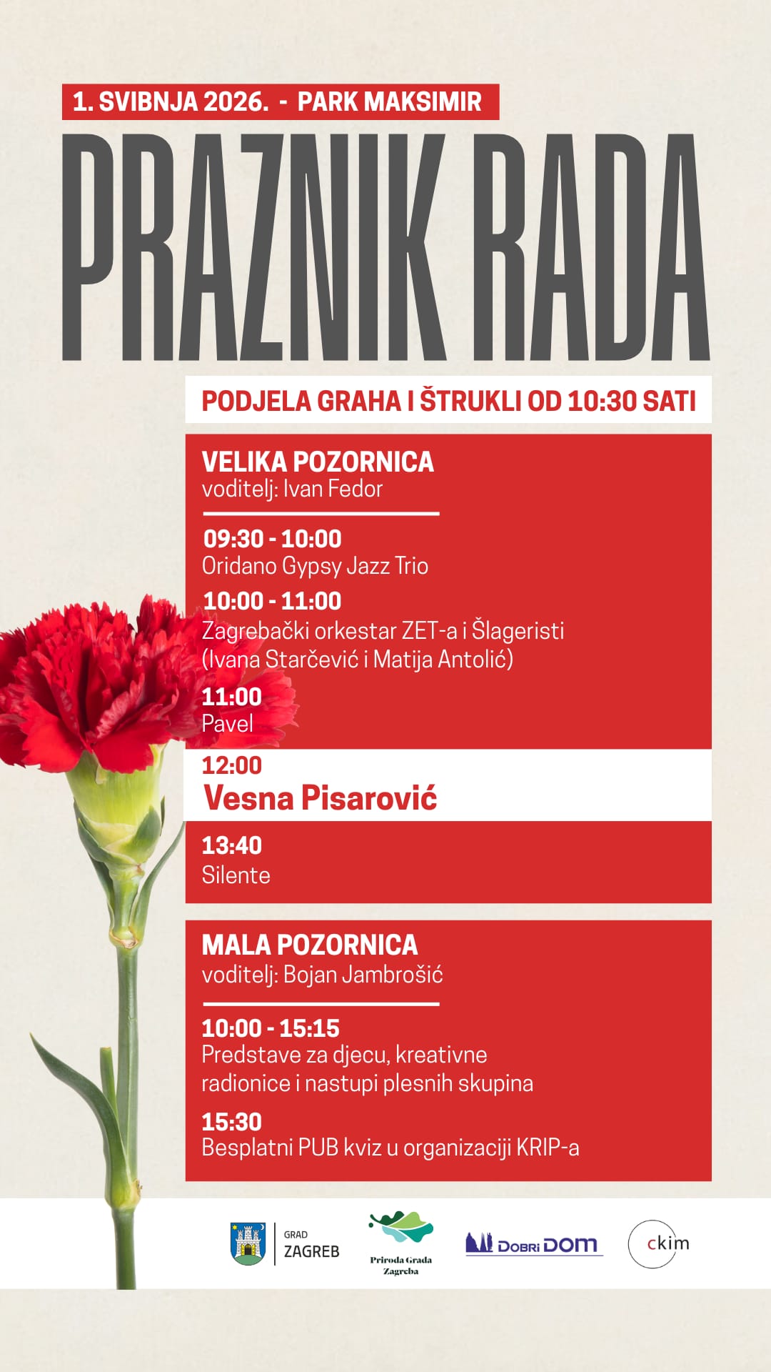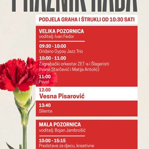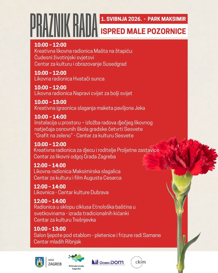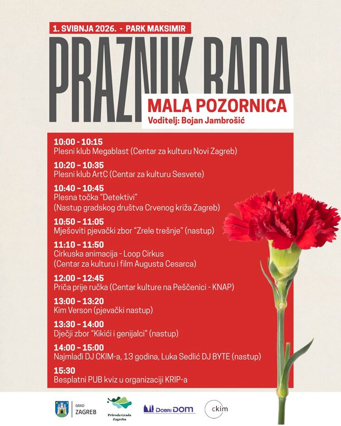 Međunarodni praznik rada i ove će se godine obilježiti u parku Maksimir 1. svibnja uz bogat glazbeni i zabavni program, kao i tradicionalnu podjelu prvomajskog graha i štrukli. Program organizira Grad Zagreb u suradnji s gradskim ustanovama Priroda Grada Zagreba, Dobri dom i Centar za kulturu Maksimir, a odvijat će se na dvije pozornice kroz cijeli dan.
